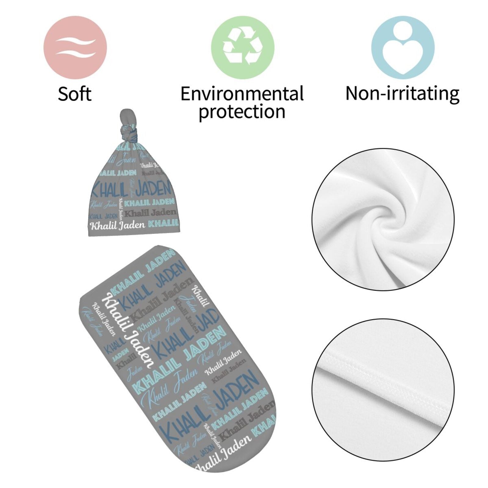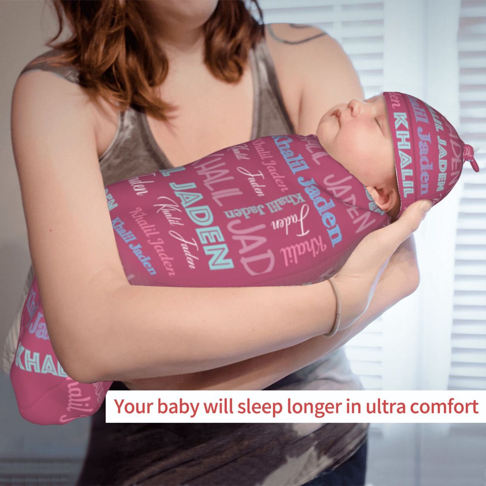 - 💝【Package Include】: 1* 20.8"x11.4" personalized swaddle blanket. 1*13"x6.5" crib hat with same name. Beanie hat has an adjustable knot on the top, which can be tightened or loosened as needed to ensure comfort for newborns. Personalized swaddle bag has no zipper or hidden button to protect the baby's delicate body