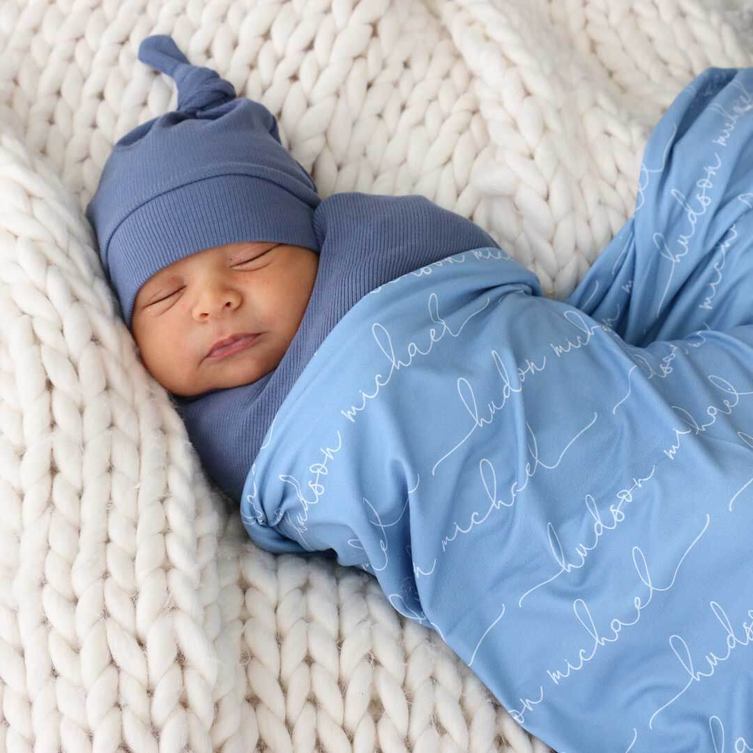 Personalize a sweet swaddle + hat set to bring your precious little one home from the hospital. Use this versatile keepsake for swaddling, tummy time, as a nursing cover or to simply catch that oh so sweet baby drool!