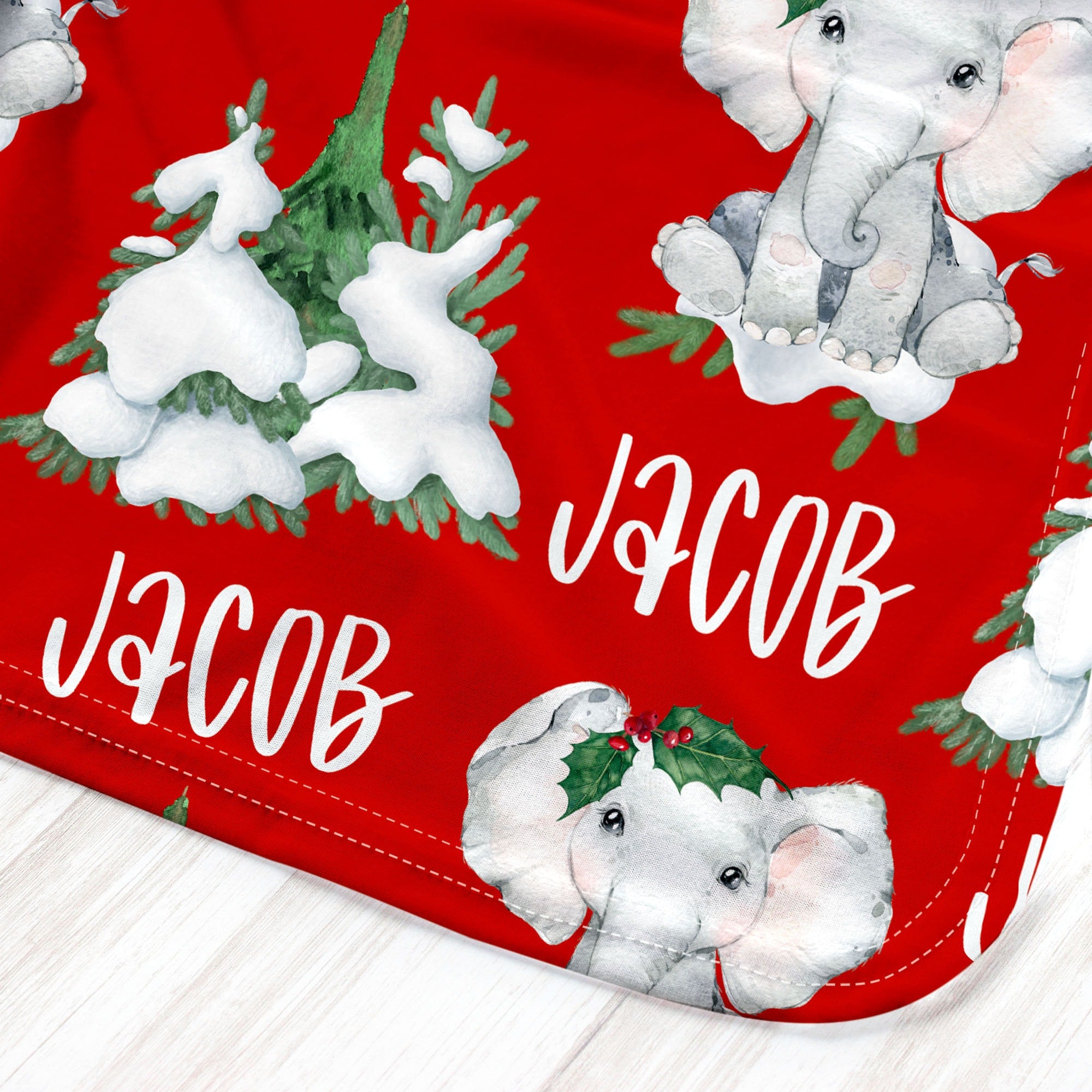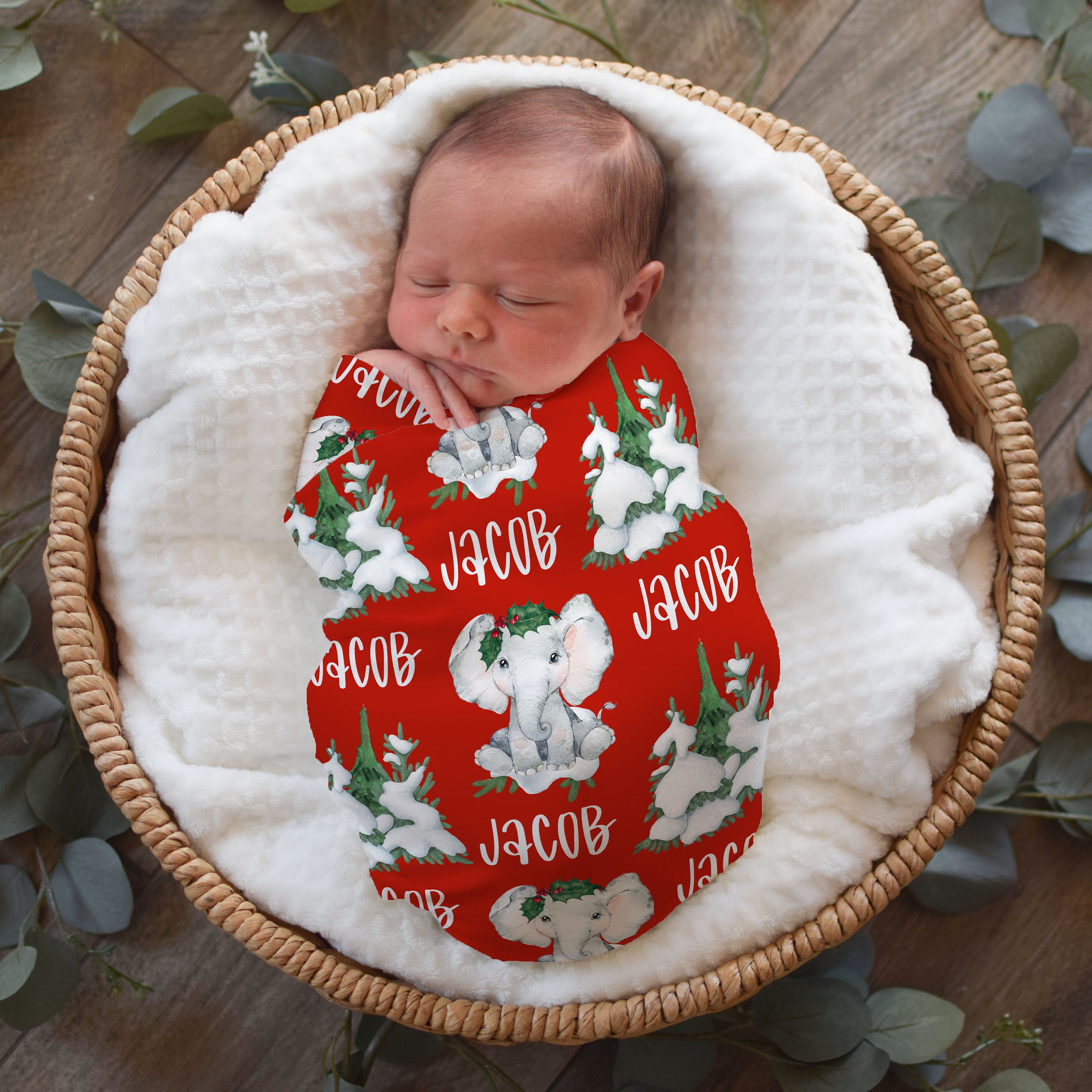 If you'll have a new baby boy or girl in your life for Christmas this year, this adorable elephant and snowy trees swaddle set would be the perfect wrap when family meets baby! Choose from a swaddle blanket, hat and/or headband and customize with new baby's name in your choice of our fonts.!