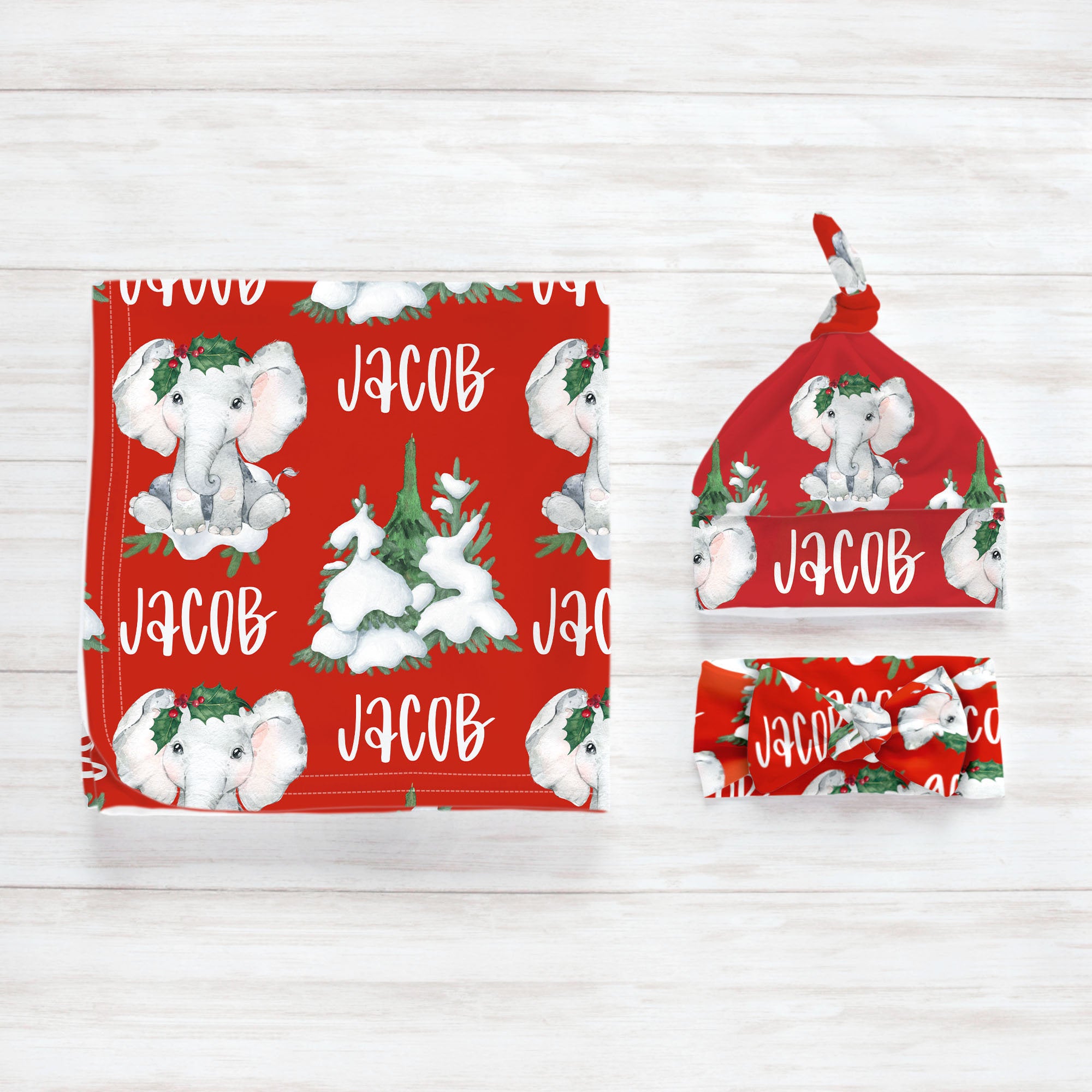 Personalized Christmas Elephant and Snowy Trees Swaddle Headband Hat Set